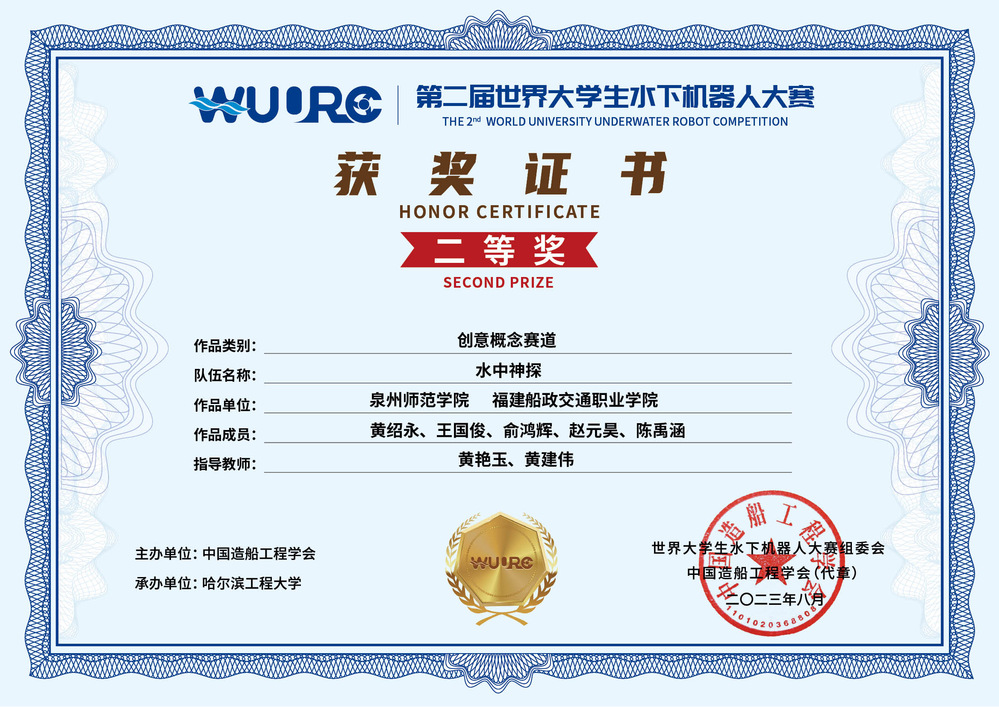 8月11日至13日,第二届世界大学生水下机器人大赛在哈尔滨工程大学举行,由我院教师黄艳玉与福建船政交通职业学院教师黄建伟指导的学生参赛队(队长:交航学院黄绍永,队员:交航学院王国俊、俞鸿辉,赵元昊,福建船政交通职业学院陈禹涵)荣获创意概念赛道二等奖。这是k8凯发(中国)首次进入此项大赛并取得优异成绩。