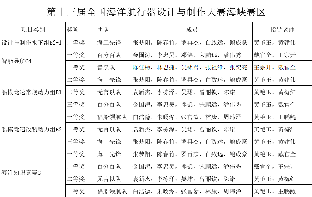 在此前进行的海峡区域赛中,我院选派的代表队在设计与制作水下组、智慧船舶与海洋工程技术-智能导航组、船模竞速常规动力组、船模竞速改装动力组、海洋知识竞赛这四个项目中表现优异,并取得一等奖3项,二等奖7项,三等奖3项的好成绩,全部推选进入本次国赛。