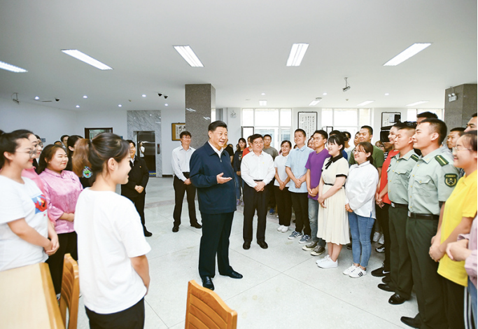 2019年7月15日至16日,中共中央总书记、国家主席、中央军委主席习近平在内蒙古考察并指导召开“不忘初心、牢记使命”主题教育。这是16日上午,习近平在内蒙古大学图书馆同学生们亲切交谈,勉励他们志存高远、脚踏实地、发奋图强。 新华社记者 谢环驰/摄