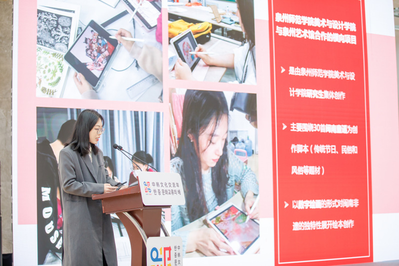 美术与设计学院副院长陈超淼副教授应邀作为本次研讨会的学术主持。我院共有1位青年教师代表和8位学生代表参会。施并招老师做了题目为《地域文化视角下的泉州文创设计研究》的主题发言,从地域文化出发,介绍了我院师生结合在地文化设计的文创产品,分享了泉州文化产品的设计现状和未来的开展方向。研究生谢丽妍做《闽南非遗童谣绘本》创作分享发言,介绍童谣绘本的创作过程,并阐述了该绘本具有育人特色、品牌特色、创新特色的创作理念。