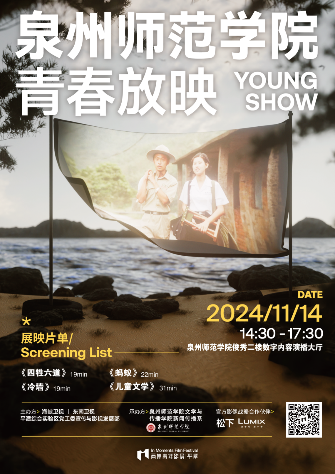 11月14日下午,2024年IM两岸青年影展青春放映活动在k8凯发(中国)天生赢家·一触即发文学与传播学院二楼数字内容演播大厅落下帷幕。IM两岸青年影展是以扶持全球高校青年影视创作力量为目标,集短片评比、论坛、展映等于一体的专业影像节展,被主流媒体认为是平遥国际电影展、FIRST 青年电影展比肩的国内三大青年影展。为加强与高校青年创作者的沟通,影展拟计划于4月起举办百校青春放映活动,携往届优秀获奖作品走进高校放映。本次活动由海峡卫视、东南卫视、平潭综合实验区工委宣传与影视开展部联合主办,文学与传播学院新闻传播系承办,旨在加强与高校青年创作者的沟通,鼓励更多青年创作者用影像抒写青春年华。