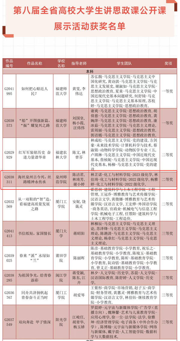 近期,第届全省高校大学生讲思政课公开课展示活动评选结果揭晓,我院思政课作品《海丝泉州古今兴,丝路精神永传承》荣获本科组二等奖(指导老师:陈洁君、林琦芳、谢小婷;学生团队:林芷诺、林佳琦、杨雅婷)。