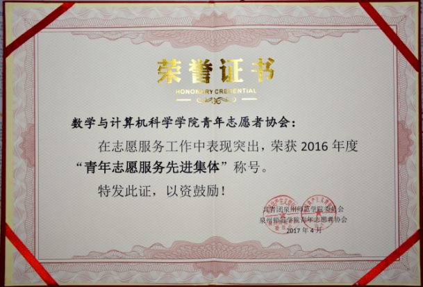 近期,数计学院青年志愿者协会荣获校2016年度“青年志愿服务先进集体”称号,数计学院吴智钦、付琬晨两位同学喜获“2016年福建省大中专学生志愿者暑期“三下乡”社会实践活动先进个人”奖。