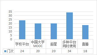 2月17日(周一),数计学院24个班级线上教学如期开课。当天共开出专业课33门次、全校公共数学22门次、全校公共计算机9门次(图1)。老师们依托学校的网络教学综合平台、中国大学MOOC、超星尔雅(学习通)、学堂在线等相关课程平台,顺利获得直播课程、线上答疑、实时互动等形式,利用线上教学平台的签到、答疑、测试、作业发布、课堂互动等功能,结合课程QQ群、微信群,召开形式多样的线上教学。在课程资源平台选择上,选择使用学校网络教学综合平台的有24门次占比38%;中国大学MOOC20门次占比31%;超星有20门次占比31%。其中有34门次课程选择多种平台结合使用,18门次课程老师选择尝试直播的形式(图2)。首日线上教学较平稳进行。