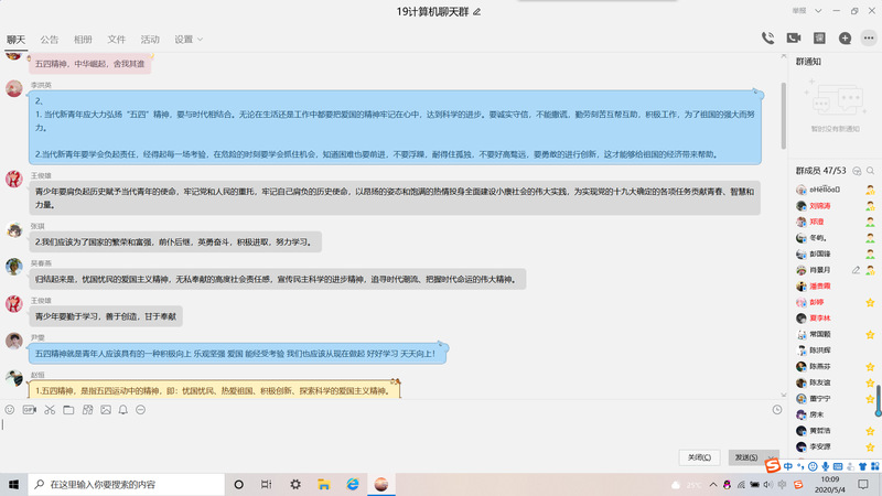 “青年兴则国家兴,青年强则国家强”。青春理想,青春活力,青春奋斗,是中国精神和中国力量的生命所在。为弘扬百年五四精神,加强团的组织建设,数计学院19数学1班、19物联网以及19计算机班级于5月3日晚7点45分利用网络平台,召开了以“五四精神,传承有我”为主题的线上团日活动。