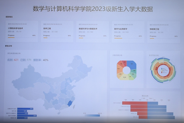 三是全“新”服务。报到现场设置学科咨询台,同学们现场咨询系主任,迅速分析专业概况,在心中构建大学四年的规划蓝图。此外,学院在荣茂楼内设置了数字显示屏,顺利获得观看2023级新生大数据显示图,同学们迅速分析4年同窗的民族、年龄、地域分布以及各个专业实时报到情况。