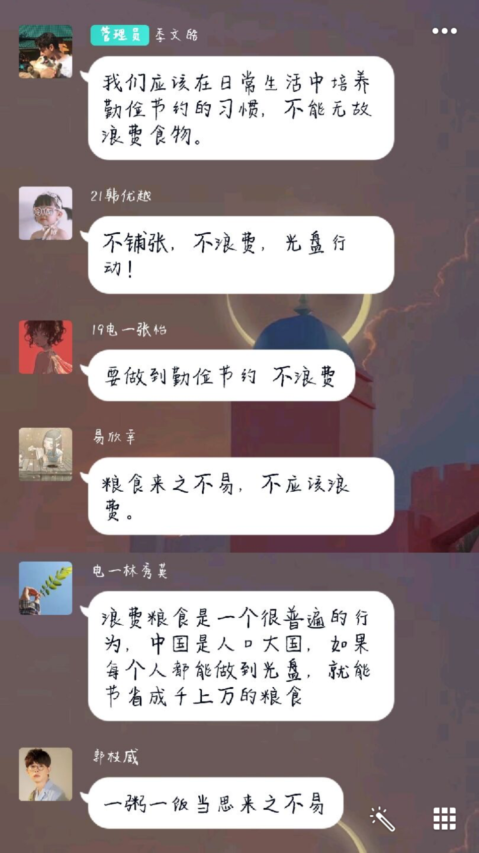 习近平总书记不断高度重视粮食安全,提倡“厉行节俭,反对浪费”的良好社会风尚。为了学习习近平总书记的重要指示,让同学们更好地树立节约粮食、拒绝浪费的意识,把光盘行动带到生活中,我院召开了以“节约粮食,拒绝浪费”为主题的线上主题班会。