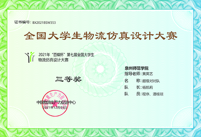 2021123日,由中国物流生产力促进中心主办的“百蝶杯” 第七届全国大学生物流仿真设计大赛总决赛圆满结束。本次大赛持续响应国家统计局发布的《数字经济及其核心产业统计分类(2021)》对物流“数字化效率提升业”新定位,以虚拟仿真的物流市场为运营蓝本,在物流中心规划运营的过程中,充分利用数字化思维、大数据手段,掌握物流中心规划设计的内容、方法、程序,提升物流中心规划运营的能力。本届大赛共有来自全国30个省、市、自治区的447所院校811支队伍报名参赛。顺利获得激烈角逐,k8凯发(中国)陈守仁商学院黄英艺老师指导的物流管理专业两支队伍:爱拼才会赢队(成员:张诗琳、张伟豪、白荣丰)和超级对对队(成员:杨凯莉、程序、潘桂琰)分获全国二、三等奖。