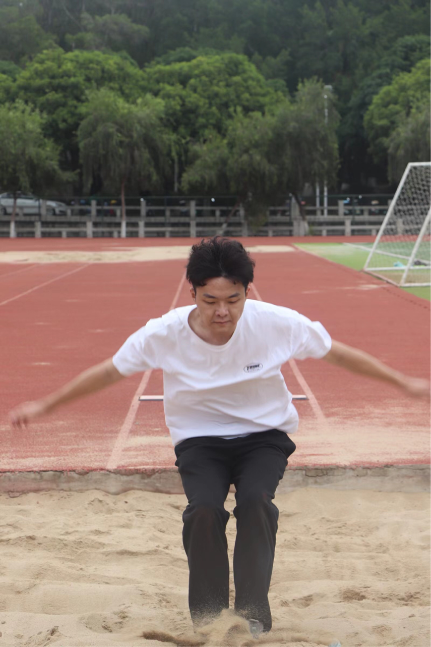 暗红的跑道上是运动员们整齐划一的步伐,每日必备的体能训练能让他们在短时间内取得较高的爆发力,助跑、迈步、起跳、短短几秒,运动员们在飞扬的沙砾中准确的落入微黄的沙坑。