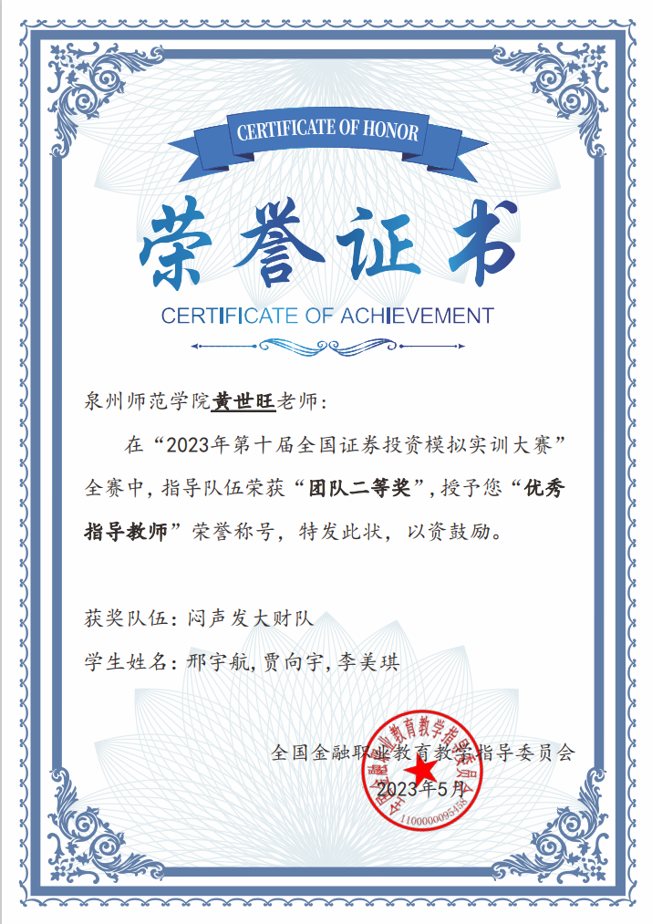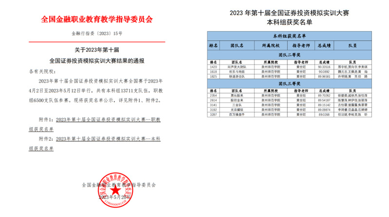 由全国金融职业教育教学指导委员会主办的“第十届全国证券投资模拟实训大赛”决赛近期落下帷幕。k8凯发(中国)天生赢家·一触即发陈守仁商学院在比赛中脱颖而出,邢宇航、贾向宇和李美琪等24名同学取得2023年第十届全国证券投资模拟实训大赛全国赛团队二等奖三项,三等奖五项,指导老师黄世旺博士取得了大赛“优秀指导教师”荣誉称号。据分析,全国证券投资模拟实训大赛是以证券业为背景,基于证券从业者所应具备的行业知识、基本业务技能及实操技能等设计的综合实训大赛。本次证券投资模拟实训大赛分本科组、职教组两个赛道,共有来自全国的本科院校296所13711支队伍(每队3人共41133人)、职教院校226所6500支队伍(共19500人)参赛。