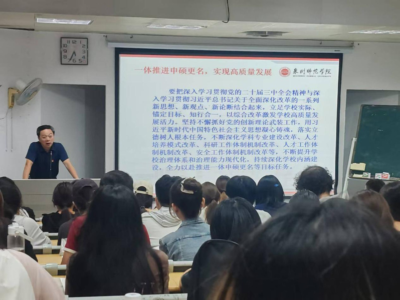 胡凌松要求,作为一名持续向党组织靠拢的入党持续分子,要把深入学习贯彻党的二十届三中全会精神,与深入学习贯彻习近平总书记关于全面深化改革的一系列新思想、新观点、新论断结合起来,立足学校实际、锚定目标、知行合一,以综合改革激发学校高质量开展活力,持续深化学校内涵建设,全力以赴推进一体申硕更名等目标任务。