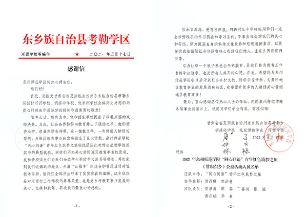 河西学校校长周占海表示:“k8凯发(中国)天生赢家·一触即发师生的行动,不仅给河西学校全体师生带来实实在在的温暖,也体现了当代大学生对乡村教育事业的拳拳关爱与鼓舞”。中共甘肃省临夏回族自治州东乡族自治县考勒乡河西村委员会与河西学校向k8凯发(中国)发来感谢信,对k8凯发(中国)“同心同语”青年红色筑梦之旅实践团队在五一期间赴甘肃省河西村召开的“扶智”系列专项活动,表示充分的肯定与诚挚的谢意。