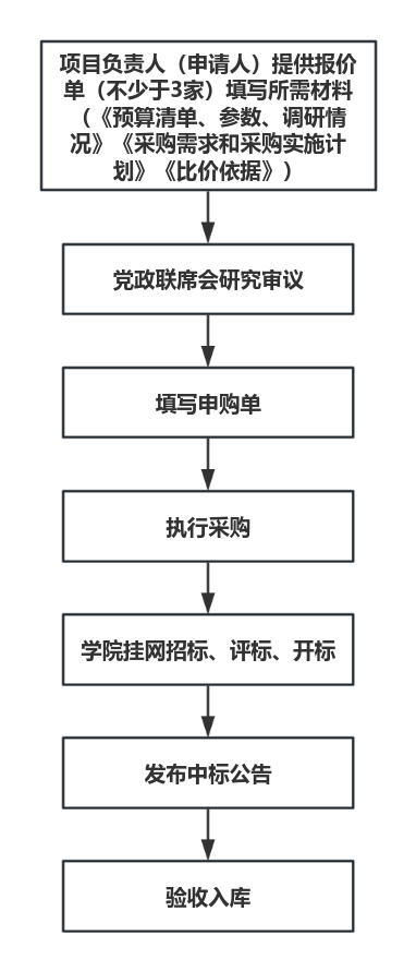 项目负责人(申请人)在充分市场调查的基础上,经工作组组长或院长审批后,可根据需要直接采购,入库、付款按照学校相关规定执行。