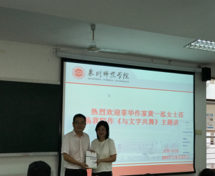 2017年9月27日下午四时,泉籍菲华作家黄一泓女士莅临我院并作《与文字共舞》主题讲座。中文系主任古大勇教授、现当代文学郑丽霞博士出席讲座,15级中文系全体同学参加。