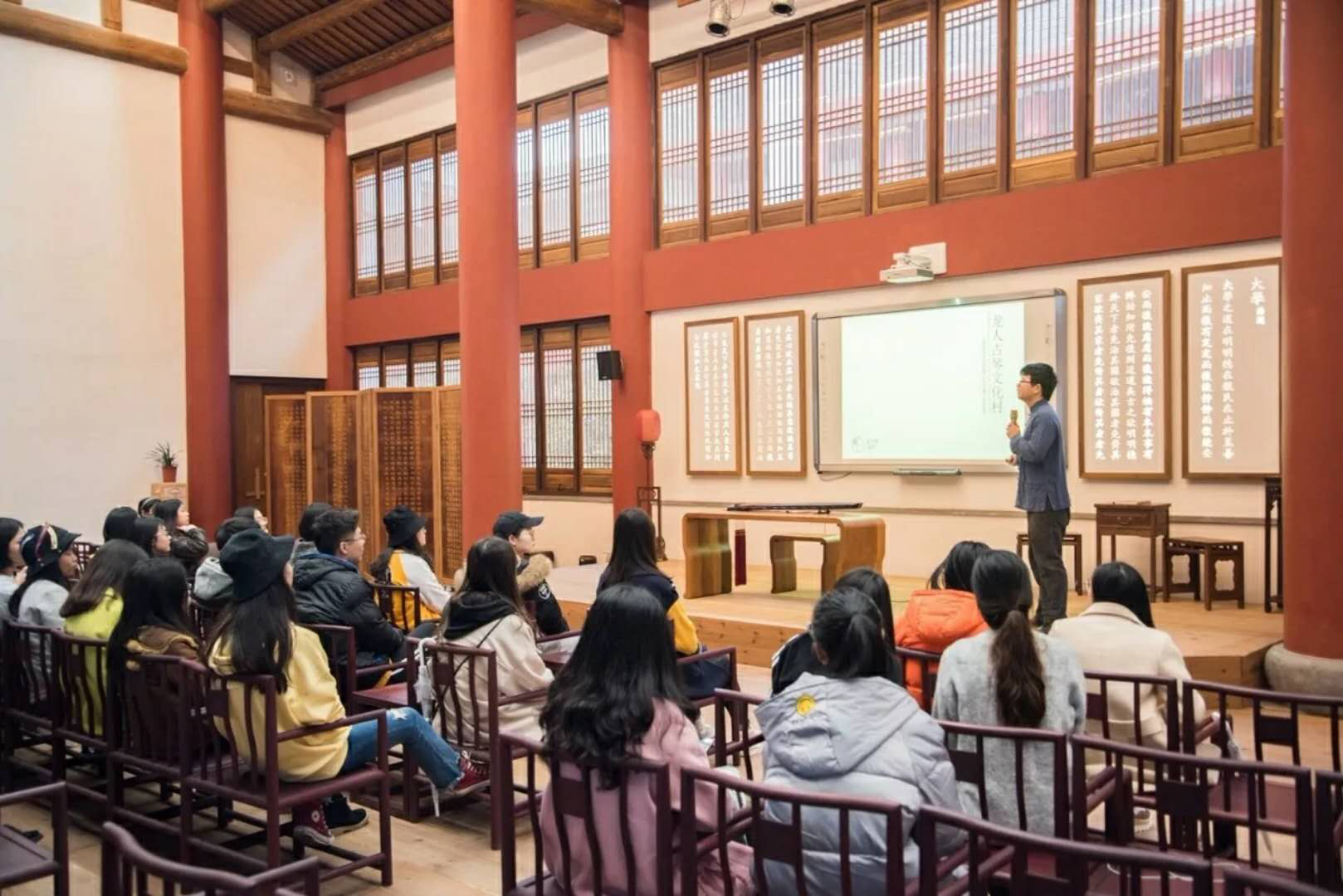 28日下午四点,穿过山路师生们抵达龙人古琴书院。稍作休整,师生在书院黄志禄老师的带领下来到大堂听取古琴文化及龙人古琴的开展介绍,并欣赏由龙人古琴教师郑伊、王西倩演绎的琴歌艺术。在座师生受古琴悠悠声韵感染,纷纷赞叹不已。随后,师生一齐参观龙人书院的斫琴展厅、龙琴典藏展厅、滕派蝶画展厅等功能场所,感受书院浓郁的传统文化氛围。