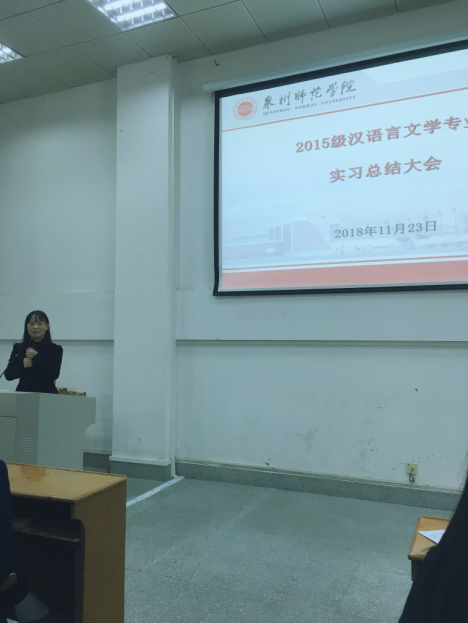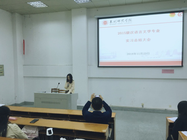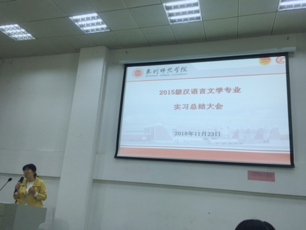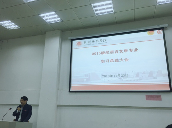 2018年11月23日, 我院召开2015级汉语言文学专业实习总结大会活动顺利召开。会议由我院中文系主任古大勇教授主持, 杨秋生副院长、郑小雅老师、郑亚芳老师、2015级各实习队成员、2016级中文全体学生参加,