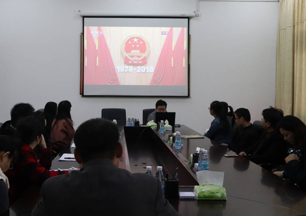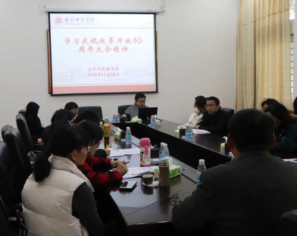 12月18日上午,文传学院于俊秀东楼会议室组织观看并学习庆祝改革开放40周年纪念大会。校长屈广清莅临指导,院长谢英、院党委书记王勇卫以及党委委员、各科室行政人员,部分师生党员参加此次会议。