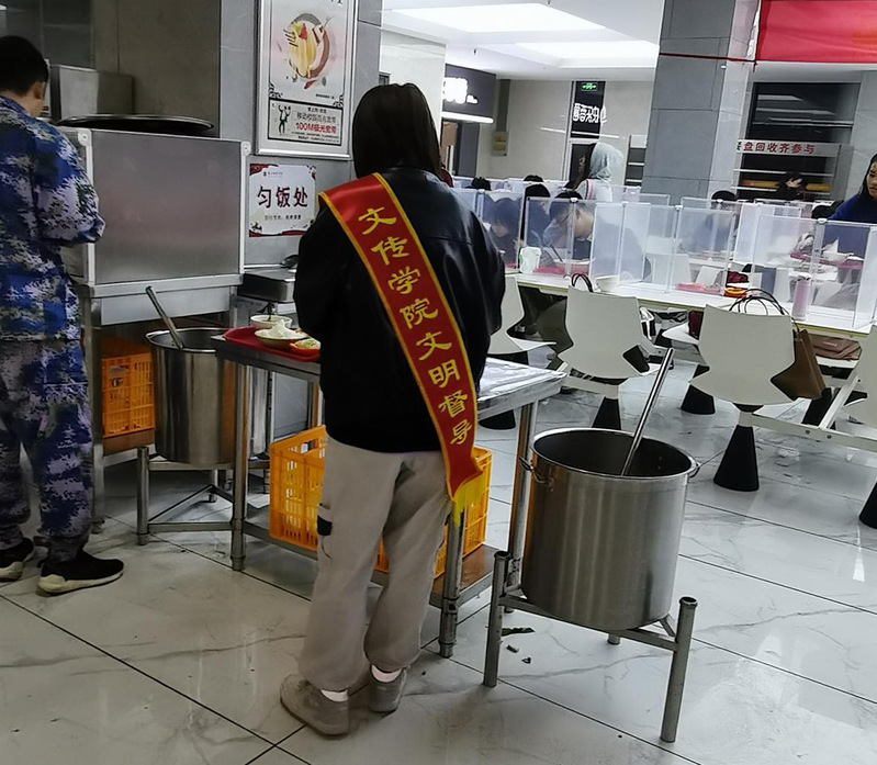 为加快构建德智体美劳全面培养的教育体系,贯彻落实习近平总书记对制止餐饮浪费行为重要指示精神,发扬中华民族文明有礼、勤俭节约的传统美德,连日来,文学与传播学院志愿者们于学生第三餐厅召开文明督导活动。
