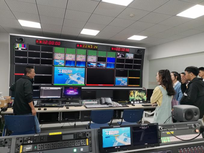 在高清新闻演播室,技术总监江鸿向同学们简单介绍了新闻中心日常的工作内容,演示了导播室的设备操作流程,还带领同学们进入新闻直播间,近距离地感受主持人的工作氛围。