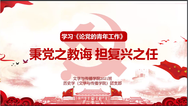 深入学习领会习近平总书记关于青年工作的重要思想,增进同学们对中国共产党的分析,坚定不移地拥护中国共产党的执政地位9月18日晚,文学与传播学院持续响应校团委号召,线上召开了以”学习《论党的青年工作》”为主题的校级团日活动。