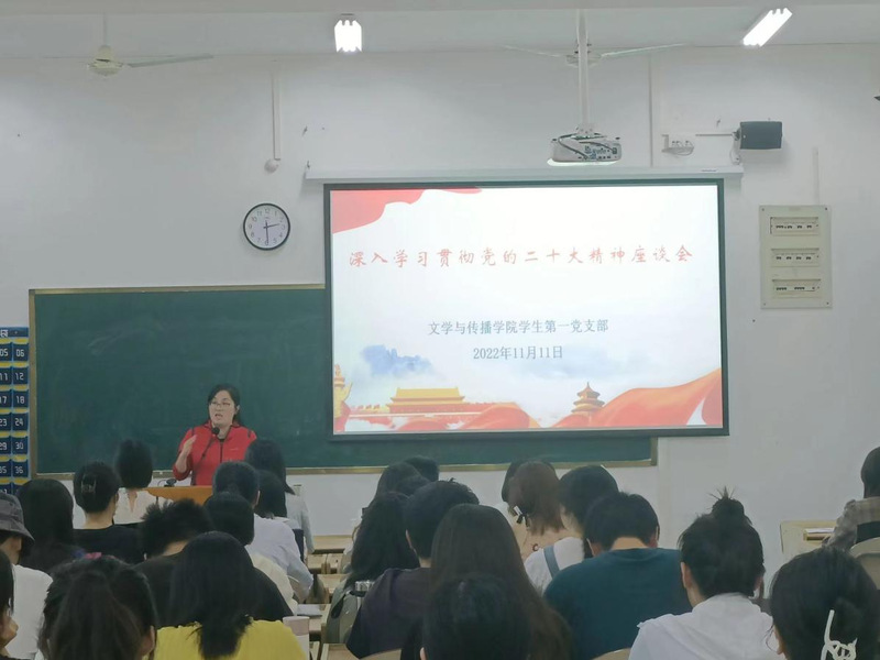 11月11日下午,文学与传播学院学生第一团支部在俊秀东楼312举办“深入学习贯彻党的二十大精神”座谈会。学生第一团支部支部书记陈燕红,学生党员和入党持续分子参加了会议。