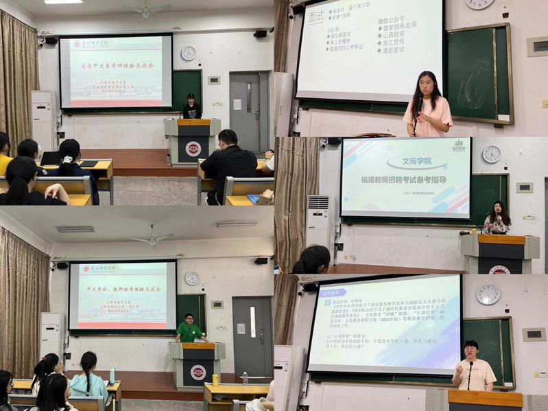 在教师招考培训讲座上,闽试教育吴悠老师就“教育综合知识”笔试科目的“时事政治”“心理学”“教育学”及“师德与教育法规”等四个模块为同学们进行详细讲解,传授答题技巧。高婕、刘越同学等分享了不同地市区面试教师的经验