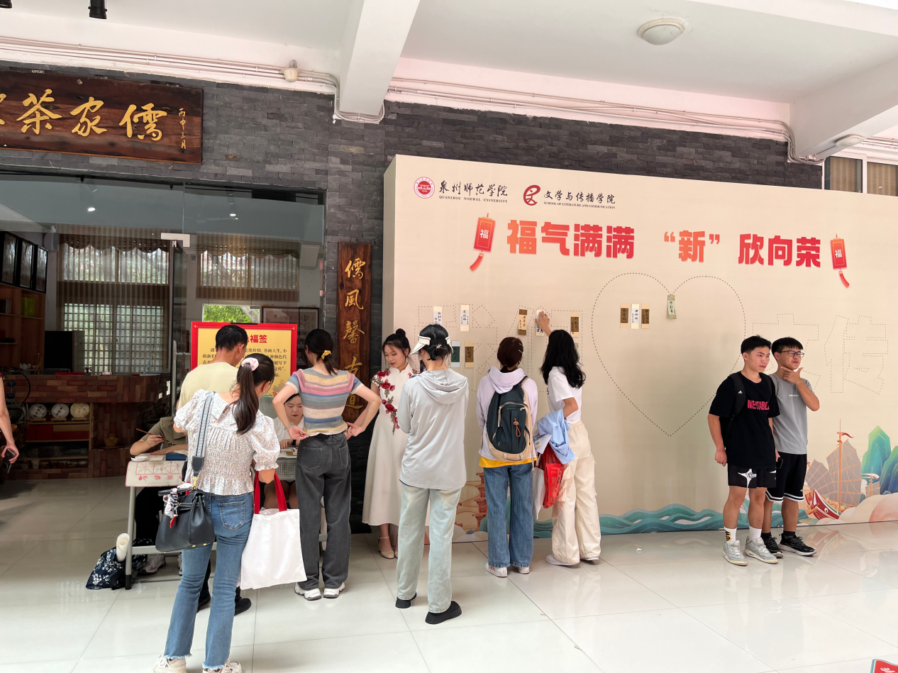 迎新当天,一系列特色环节得到了新生的欢迎:“跨五色栏”表达了学院对新生的美好祝愿。“行入学礼”,引导新生向孔子像作揖,让新生分析并传承师范专业尊师重教的传统。“遇五雅文人”,五位文传学子分别扮演五位不同时代的才子,让新生身临其境感受古韵。“转五色盘”与“接五色书签”则以充满乐趣的方式,让新生切身感受专业的特色,帮助他们尽快融入学院集体。此外,在党员先锋岗上放置有《党的二十大报告报告》《习近平新时代中国特色社会主义思想专题摘编》等书籍,在新生与学长学姐们“入党流程我知道”一问一答一签名中,坚定“学习党的二十大报告,永远跟党走”的政治信仰和理想信念。活动现场氛围热烈,活动取得了圆满的成功。