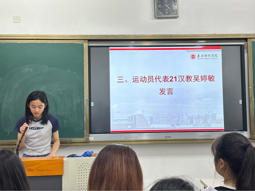 紧接着,体育部部长陈雅勤对本次运动员筛选、运动会筹办以及训练工作的召开情况作了简要介绍;此外,运动员代表吴婷敏同学分享了自己作为运动员的心路历程,呼吁全体运动员不断勇往直前,超越自我。最后,教练员代表22体教陈俊宇同学鼓励全体运动员在参赛过程中保持平常心,发挥潜能,在赛场上不断拼搏,展现青春风采。