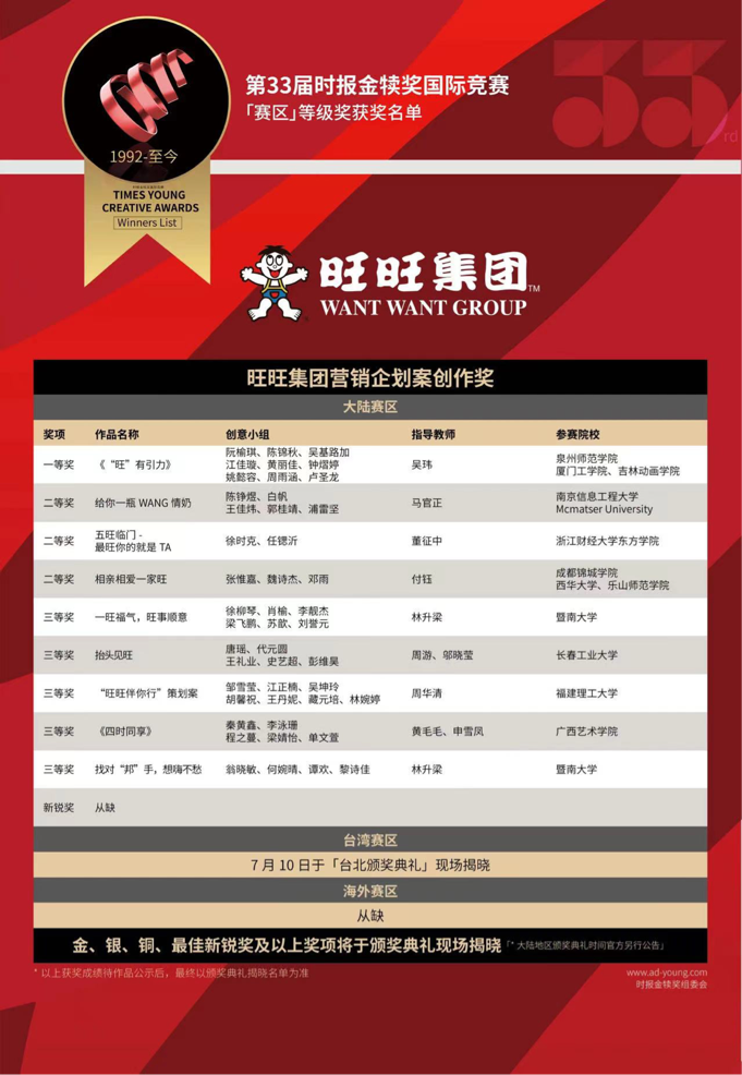 第33届时报金犊奖国际竞赛「等级奖」获奖名单日前公布。由我院吴玮老师指导的2022级广告学(闽台合作)阮榆琪、钟熠婷、姚懿容、黄丽佳、卢圣龙、吴基路加、江佳璇同学共同创作完成的《“旺”有引力——旺旺集团营销企划案》喜获时报金犊奖策划案类大陆赛区一等奖。这是继2022年我院广告学专业学生获中国大学生广告艺术节学院奖金奖之后,斩获的又一项专业顶级奖项。