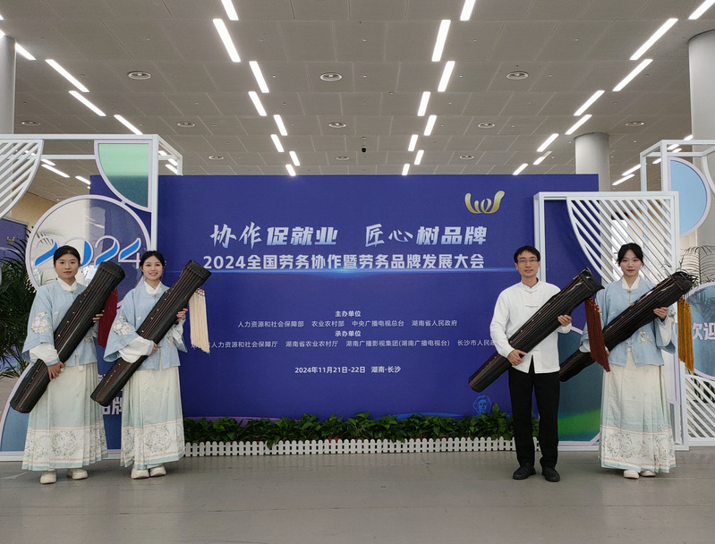 1121日,文学与传播学院吾有古琴社三位学子受邀参加由人力资源和社会保障部、农业农村部、中央广播电视总台、湖南省人民政府共同办的“2024全国劳务协作暨劳务品牌开展大会”,在活动的开幕式中进行古琴主题演出。