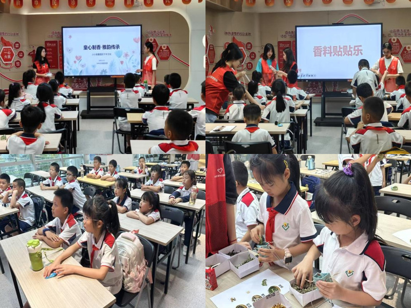 活动中,志愿者结合古籍知识与现代趣味,顺利获得图文PPT与艾草、薄荷、陈皮等中草药实物,向孩子们讲解香文化千年历史及香料药用价值。互动环节中,“香料盲盒辨辨乐”点燃热情,孩子们闭眼嗅闻石菖蒲的辛香、苍术的苦香,争相为薄荷、陈皮等贴上名称标签;香囊DIY区,志愿者协助孩子们协作填充香囊。