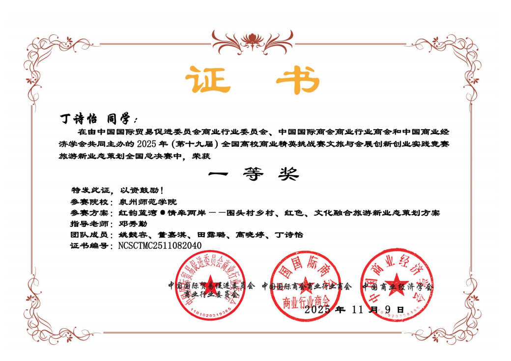 11月21日至24日,第十九届全国高校商业精英挑战赛文旅与会展创新创业实践竞赛全国总决赛精英赛在浙江金华永康隆重举行,姚懿容、丁诗怡、董嘉淇等同学到现场参加总决赛。作品《红韵蓝湾·情牵两岸——围头村乡村、红色、文化融合旅游新业态策划方案》斩获全国一等奖,并入围2026年国际文旅与会展大赛。该作品围绕“围头村”乡村文旅融合创新开展展开策划,由22级广告学(闽台合作)专业姚懿容同学、23级广告学(闽台合作)丁诗怡、董嘉淇同学共同参与创作完成。