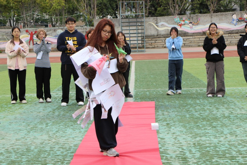 接着团队服装设计挑战将全场氛围拉满,各小组限时完成创作并讲解设计思路,展现出极强的团队协作力;最后“动力圈”环节,新生手拉手围成圆,在齐心协作中感受集体的温暖与力量。