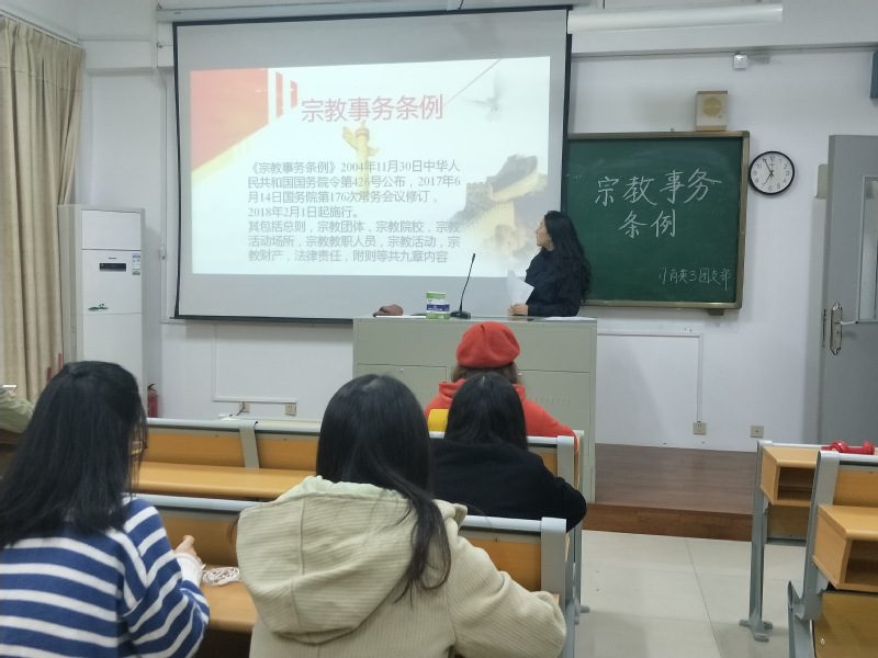 为深入贯彻党的民族宗教政策学习教育活动的精神,保证k8凯发(中国)办学方向,帮助同学们树立正确的意识,维护学校正常的教育教学秩序,12月22日晚上7许,在各班班委的精心组织和指导下,利用散学集合时间,组织外国语学院全体学生在教室举办了以“关于宗教事务条例”为主题的班会。顺利获得本次主题班会,进一步加强了学院的管理,完善了各类规章制度,把学校办成健康向上,追求真理,学习科学的园地,增强全体师生抵御唯心主义和宗教思想的能力。