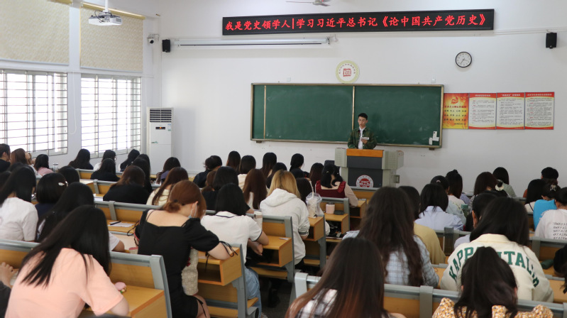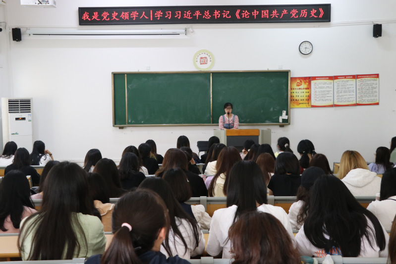 此次活动由学院团委书记陈奕希老师主持,她指出我们要把党的历史学习好、总结好,把党的成功经验传承好,发扬好。第一时间,党史领学人学生代表许之飞与同学们分享学习了习近平总书记《论中国共产党历史》第九篇——《在纪念毛泽东同志诞辰一百二十周年座谈会上的讲话》,讲话全面科学地评价了毛泽东同志和毛泽东思想的历史功绩和历史地位,系统论述了毛泽东思想活的灵魂的基本内涵和时代要求,强调必须始终坚持马克思主义的立场观点方法,坚持全面正确的历史观,坚持实事求是、群众路线、独立自主,毫不动摇走党和人民在长期实践探索中开辟出来的正确道路,把中国特色社会主义伟大事业继续推向前进。他号召同学们要跟随毛泽东同志的步伐,听从习近平总书记的引导,要有坚定不移的革命信念,勇于开拓的非凡魄力,做有志气有能力的青少年。同学们悉心听讲。随后,陈奕希老师针对为什么学党史、学什么、怎么学进行了相关导读。