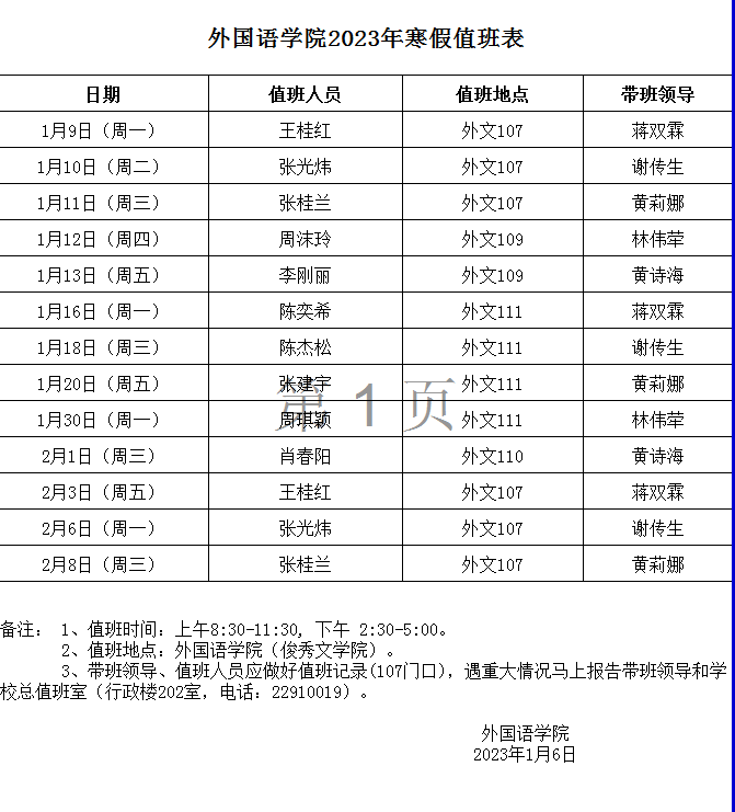 外国语学院2023年寒假值班表