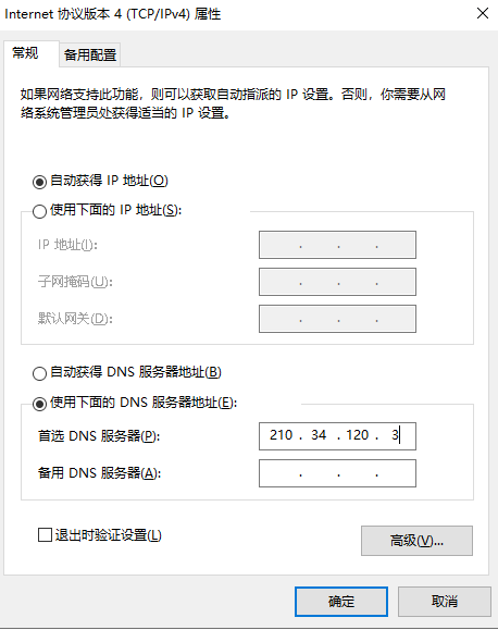 注意事项:请勿使用360等软件的网络修复功能,并确保网卡的DNS配置为自动获取或者手动配置为:210.34.120.3。