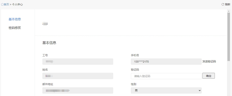 1. 修改手机号。点击发送验证码,输入短信验证码,点击确定,手机号变为可编辑状态,填写新手机号,点击下方保存。