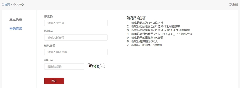 2. 修改密码。点击密码修改,输入旧密码,输入新密码,输入验证码,点击保存。