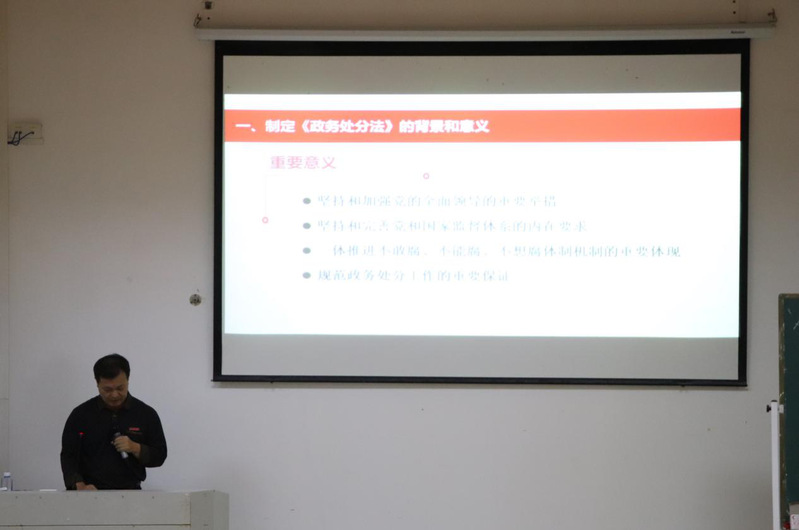 宣讲会上,洪荣文介绍了《中华人民共和国公职人员政务处分法》制定背景和重意义,并结合典型案例,详细阐释了政务处分的基本原则、适用对象、种类和程序等主要内容,重点突出、案例详实、通俗易懂。他还就抓好《中华人民共和国公职人员政务处分法》的贯彻执行提出三点意见:一是坚决扛起政治责任,把“严”的主基调长期坚持下去;二是加强对公职人员的教育,增强尊法守法用法意识;三是坚持执法必严、违法必究,发挥法规制度标本兼治作用。