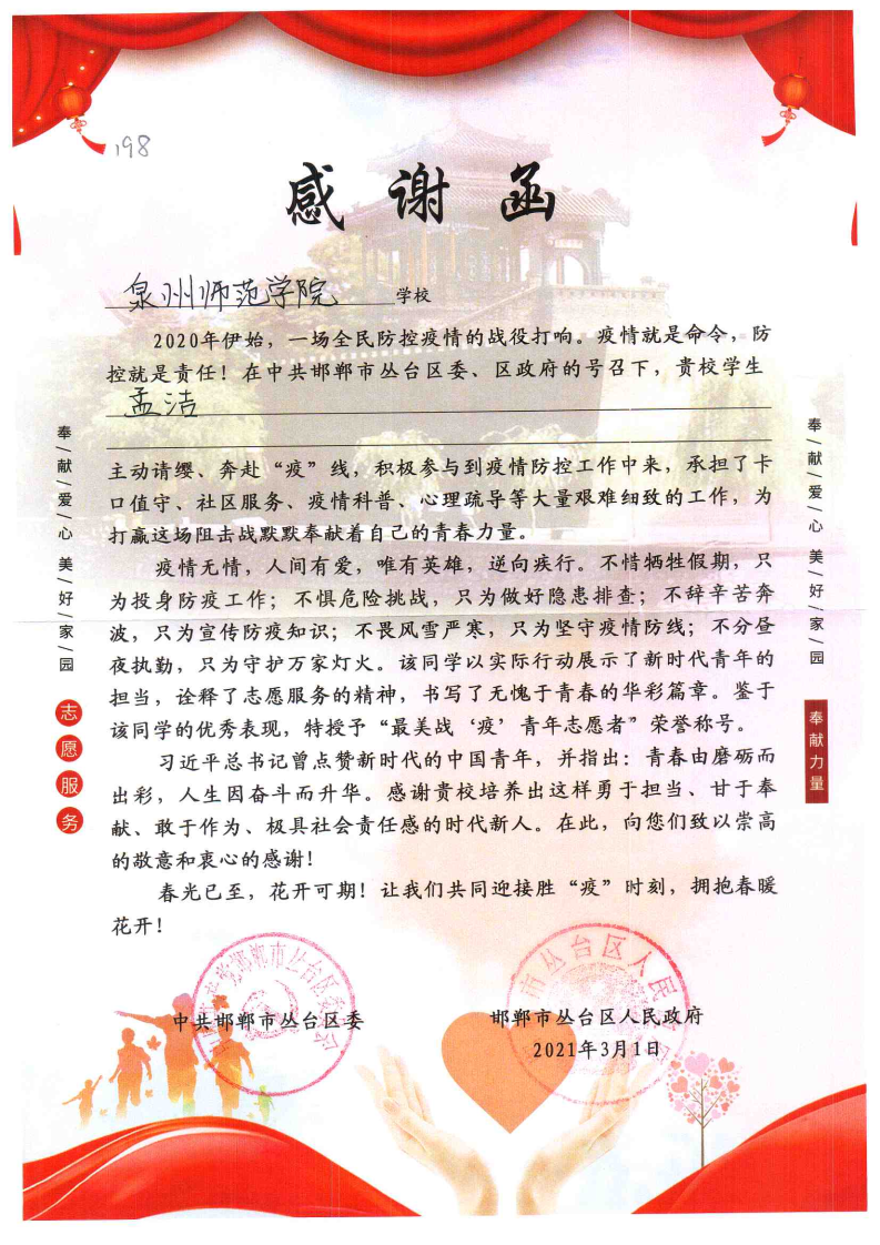近期,我院收到一封来自邯郸市丛台区的感谢函,2018级通信工程专业孟洁同学受到邯郸市丛台区委、区政府的表扬和肯定,被授予“最美战‘疫’青年志愿者”荣誉称号。感谢函中指出,2021年初河北新冠肺炎疫情发生后,孟洁同学主动请缨,持续参与志愿活动,承担了社区服务、疫情科普等大量艰难细致的工作,为疫情防控工作贡献了一份力量。