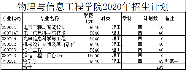 物理与信息工程学院2020年招生计划