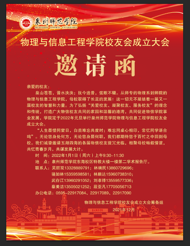 泉山苍苍,晋水泱泱;抚今追昔,弦歌不辍。从师专的物理系到师院的物理与信息工程学院,母校取得了长足的开展!这一切无不凝结着一届又一届校友的智慧和力量。为了弘扬“关爱校友、凝聚校友、服务校友”的理念和传统,打造广大物信校友共同的家园和温馨的港湾,共同促进物信学院事业开展,学院定于2022年元旦举行泉州师范学院物理与信息工程学院校友会创建大会。