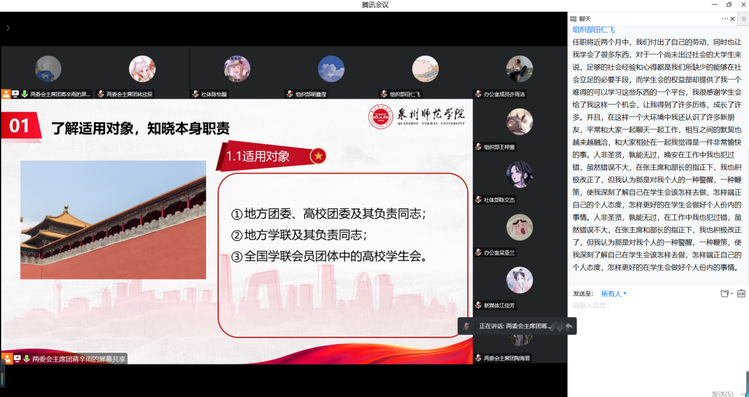 培训围绕“主责主业重聚焦,踔厉奋发再前行”主题,分为三大专题对学生会工作人员召开规章制度、团史学习、重要讲话精神等培训。会议旨在有助于学生会深化改革,落实学生会指导管理责任,加深学生干部对学生会章程的分析,同时让全体成员以史为鉴、展望未来。大家踊跃发言,发表个人感悟与心得体会。