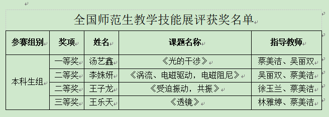 其中,在全国第十六届“格致杯”物理师范生教学技能展评中,4名学子共获教学技能比赛一等奖1项、二等奖2项、三等奖1项;在第十八届全国大学生先进成图技术与产品信息建模创新大赛全国总决赛中,共夺得电子类国家级二等奖3项、三等奖4项,机械类获国家级二等奖1项、三等奖1项;在第十三届全国大学生光电设计竞赛中荣获全国二等奖1项;在2025年TI杯全国大学生电子设计竞赛中取得省级二等奖3项,三等奖9项;在第十六届蓝桥杯全国软件和信息技术专业人才大赛中取得国家级二等奖1项,省级一等奖1项,二等奖9项,三等奖6项。