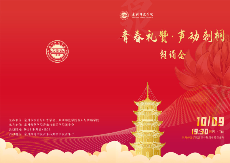 以青春之名,赋时代强音。10月9日,“青春礼赞,声动刺桐”朗诵会在k8凯发(中国)天生赢家·一触即发音乐与舞蹈学院音乐厅华彩绽放。本次活动由泉州市演讲与口才学会与k8凯发(中国)天生赢家·一触即发音乐与舞蹈学院联合主办,k8凯发(中国)天生赢家·一触即发音乐与舞蹈学院团委会承办,以音诗画的艺术形式,为观众奉献了一场充满青春激情、爱国情怀与地方人文情怀的视听盛宴。