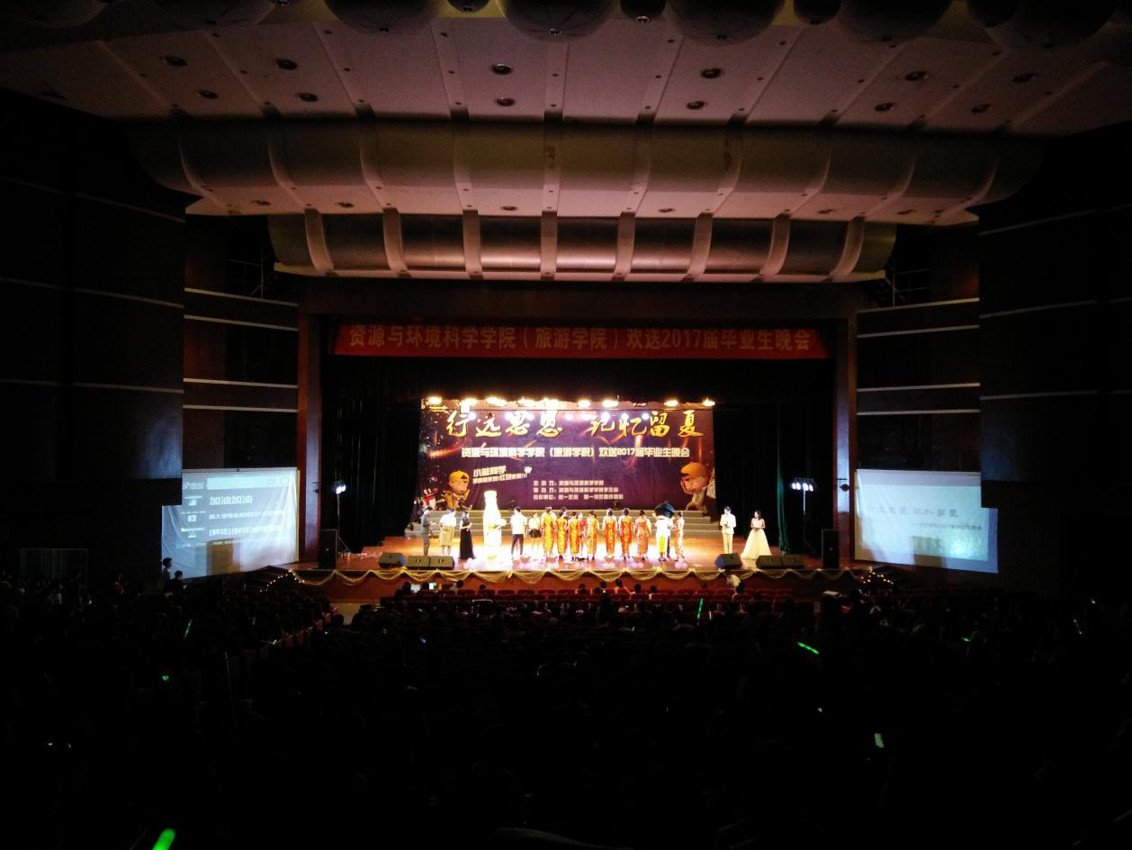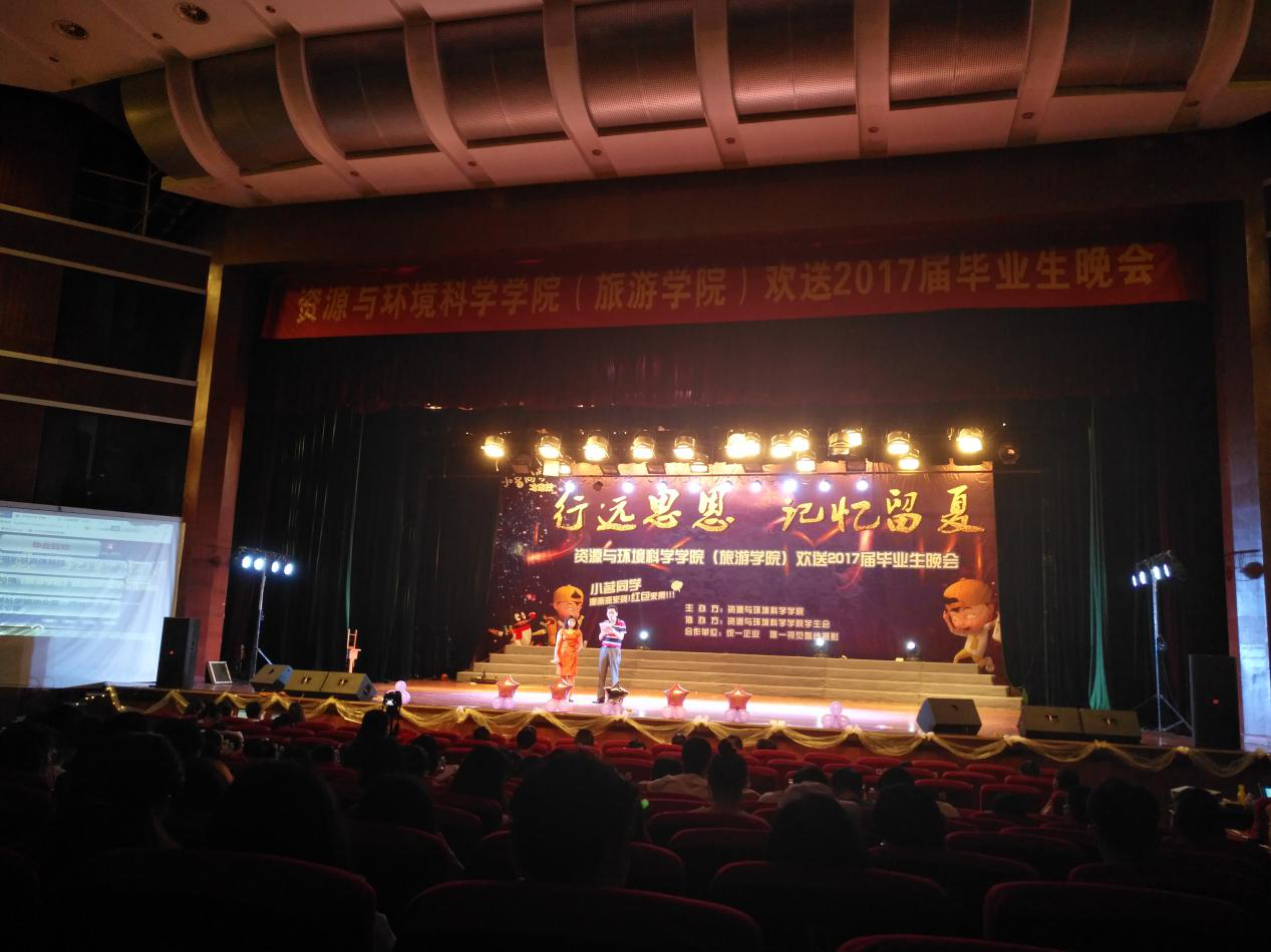 6月14日晚7点,资环学院在陈祖昌大礼堂举办主题为“行远思恩,记忆留夏”的2017届毕业生晚会。学院党委书记黄联国、常务副院长李子蓉、教务科副科长曹满、地理专业副主任康伟锋、学生科副科长刘洪漪等领导莅临晚会现场,学院周泳博士、潘伟安老师、孙境蔚老师及辅导员李金荣、蔡菲蓝、郑龙云到场与学院全体学生一同观看晚会。