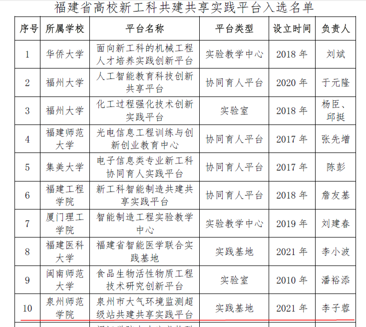 3月2日,福建省新工科教育联盟公布福建省高校新工科共建共享实践平台名单,我院院长李子蓉负责的泉州市大气环境监测超级站共建共享实践平台成功入选。