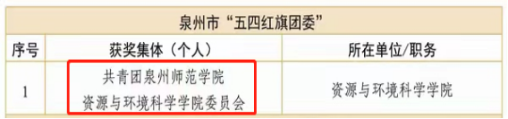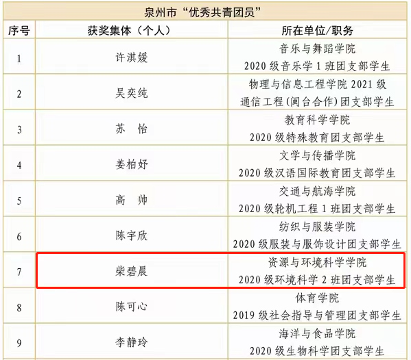 日前,共青团泉州市委、泉州市教育局下发《关于对2022年度泉州市学校系统“优秀共青团员”“优秀共青团干部”“五四红旗团委”“五四红旗团(总支部)”予以表扬的通报》(团泉委联【2023】13号),我院团委获评2022年度泉州市“五四红旗团委”;环境科学专业柴碧晨同学获评泉州市“优秀共青团员”。