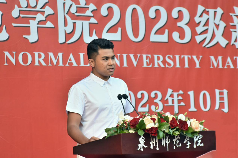 我院来自马来西亚的2023级环境科学本科生ASHVIN(音译:嘉士运)同学作为此次留学生新生代表发言,他表示,要珍惜大学的美好时光,努力学好专业知识,掌握扎实本领,将来为家乡的建设开展贡献自己的力量,他将与来自五湖四海、不同文化、不同语言的同学们友好相处、互相学习、共同成长。作为留学生他表示要深入分析中国,将亲身见闻与家乡的亲人朋友们分享,讲好中国故事,做中马两国人民友谊的使者